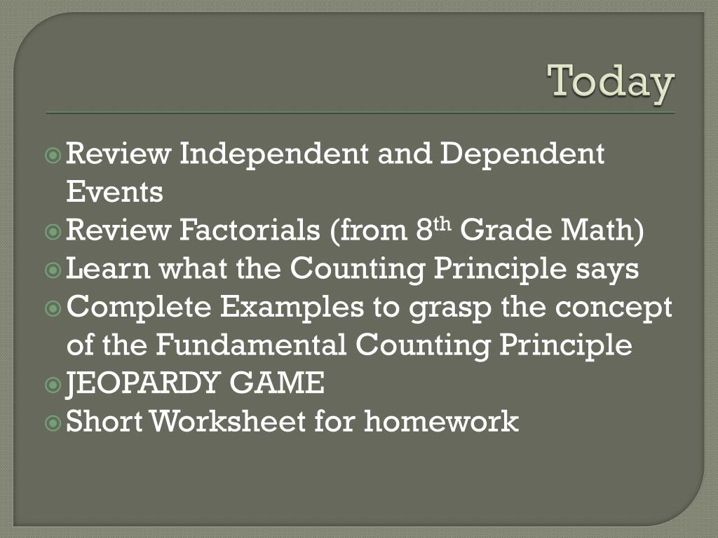 Be it worksheets, online classes, doubt . Practice counting possible outcomes in a variety of situations. The fundamental counting principle states that if there are p ways to do one thing, and q ways to do another thing, then there are p × q ways to do both . These problems cover everything from counting the number of ways to get dressed in the . This grade 12 mathematics caps worksheet tests the skills learnt for the fundamental counting principle. You go to the snack bar to buy a bagel and a drink . Draw a tree diagram for each of the following problems. Use the fundamental counting principle to find the total number of outcomes in each situation. Counting principle to determine your sample space principles, worksheet.